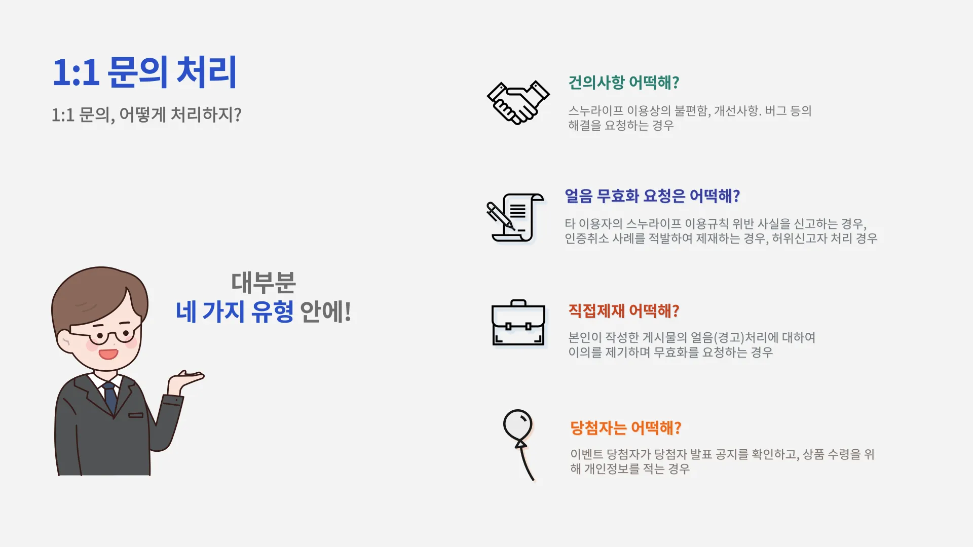 1:1 문의 처리, 커뮤니티 이용규칙 수립, 신고제도 개선 등의 역할을 도맡아 하고 있어요