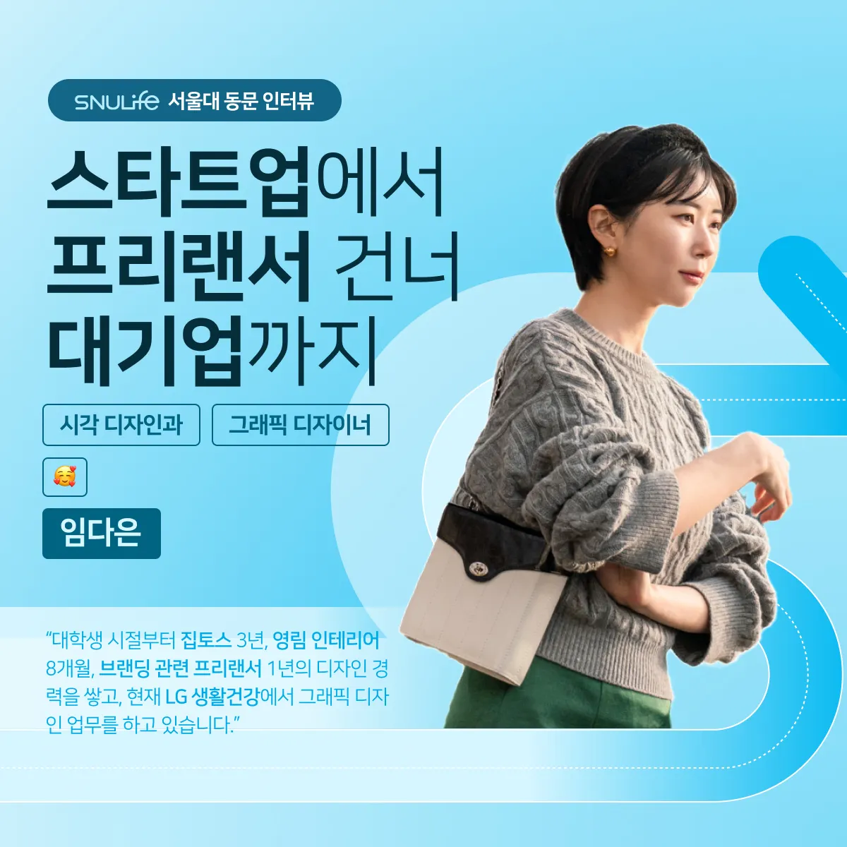 안녕하세요! 14학번으로 서울대에서 시각디자인을 전공하고, 현재는 그래픽 디자이너 포지션으로 LG생활건강에서 일하고 있는 임다은이라고 합니다.