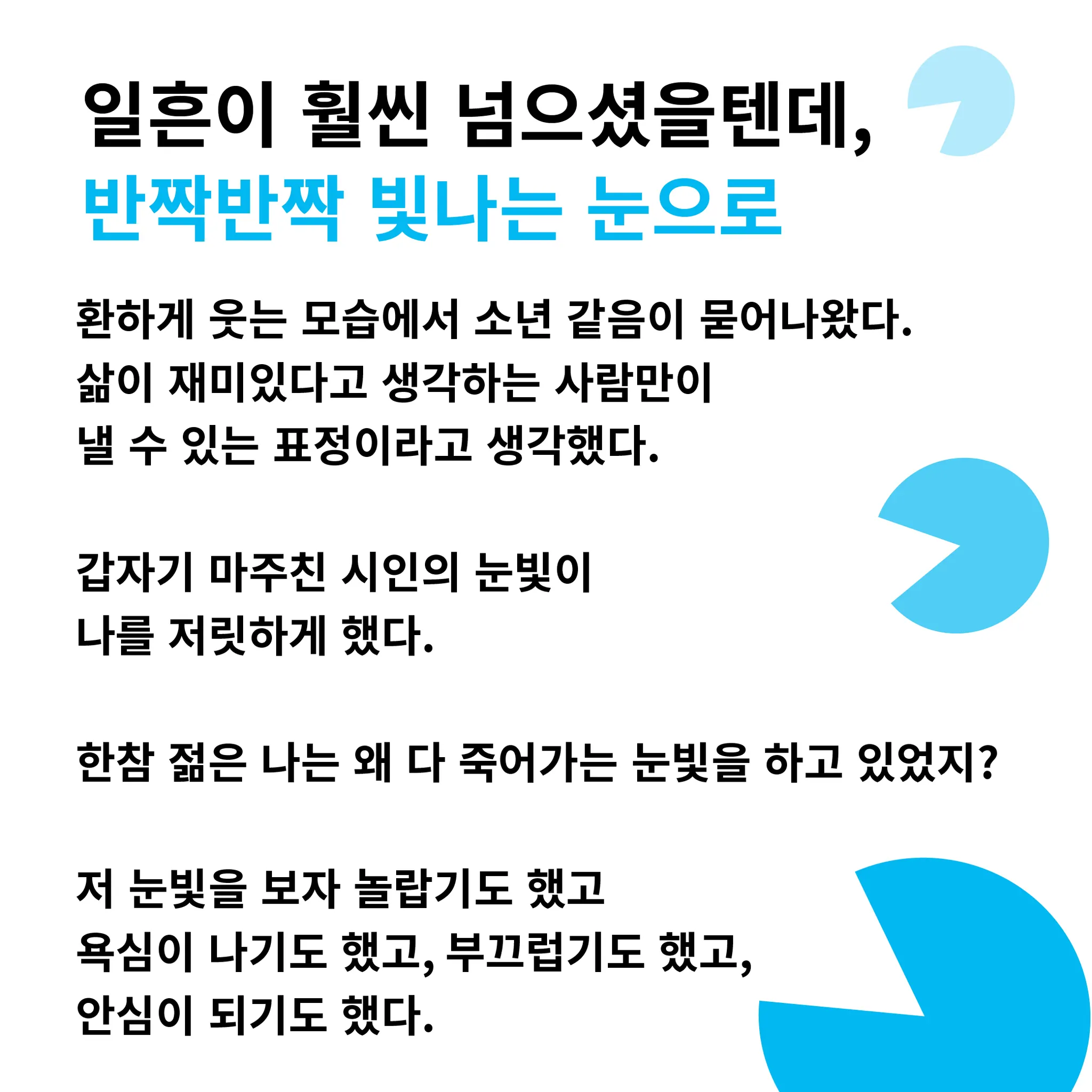 자꾸만 내 눈에 빛이 꺼지고, 마음 속에 불꽃이 꺼지고 있었다. 삶의 아름다움을 노래하던 나는 삶의 무상함과 고통을 읊조리고 있었다. 나는 그 동안 애써 짜낸 의지나 다짐으로 내 안의 불씨를 살리려고 했으나 잘 안 되었다. 그런데 갑자기 마주친 시와 시인의 눈빛이 나를 저릿하게 했다. 한참 젊은 나는 왜 다 죽어가는 눈빛을 하고 있었지? 저 눈빛을 보자 놀랍기도 했고 욕심이 나기도 했고, 부끄럽기도 했고, 안심이 되기도 했다. 온갖 삶의 파노라마를 겪고도 저렇게 빛나는 눈을 할 수 있군요. 시 하나가 가슴에 박힌 채로 나는 오랜만에 편히 웃어보았다.